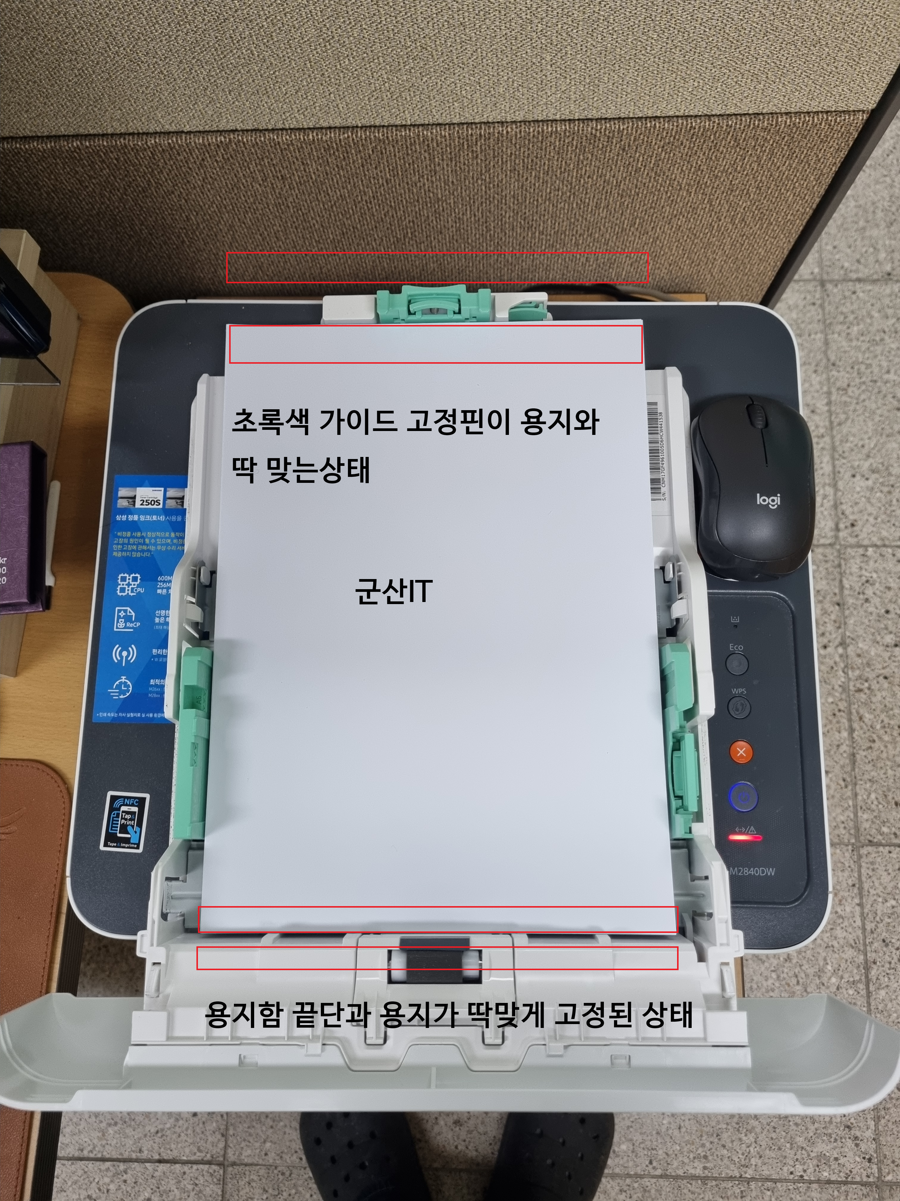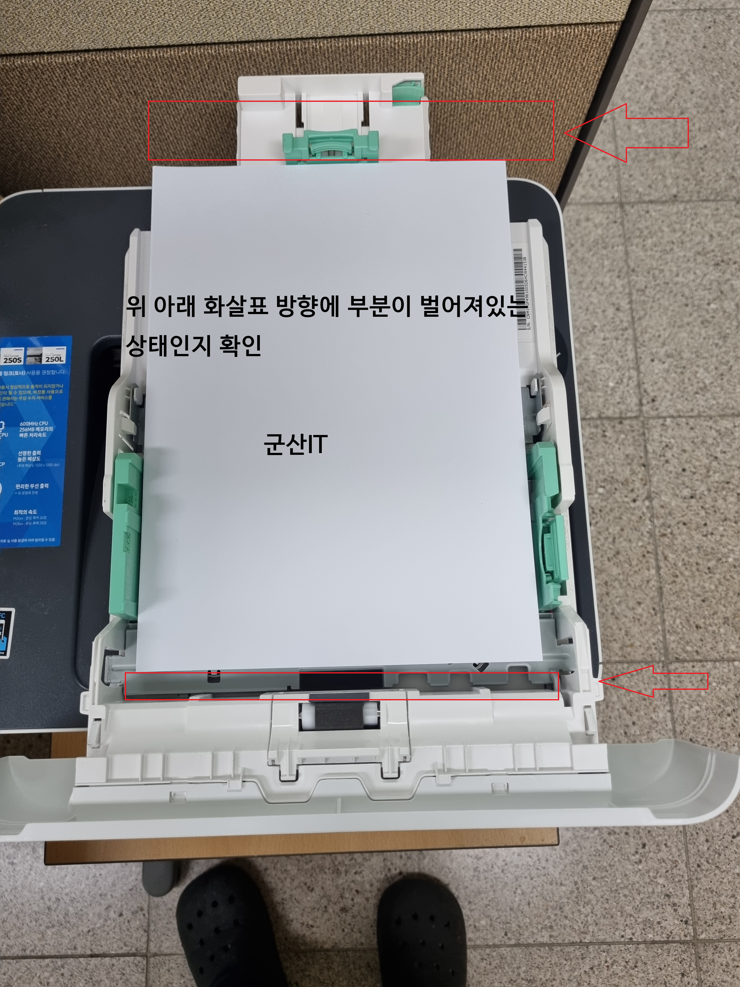 사진상의 하단 빨강박스가 보이지않게 용지를 딱 맞춰준이후 상단의 초록색 고정핀을 눌러 용지가 딱맞게 조정해주면 됩니다.