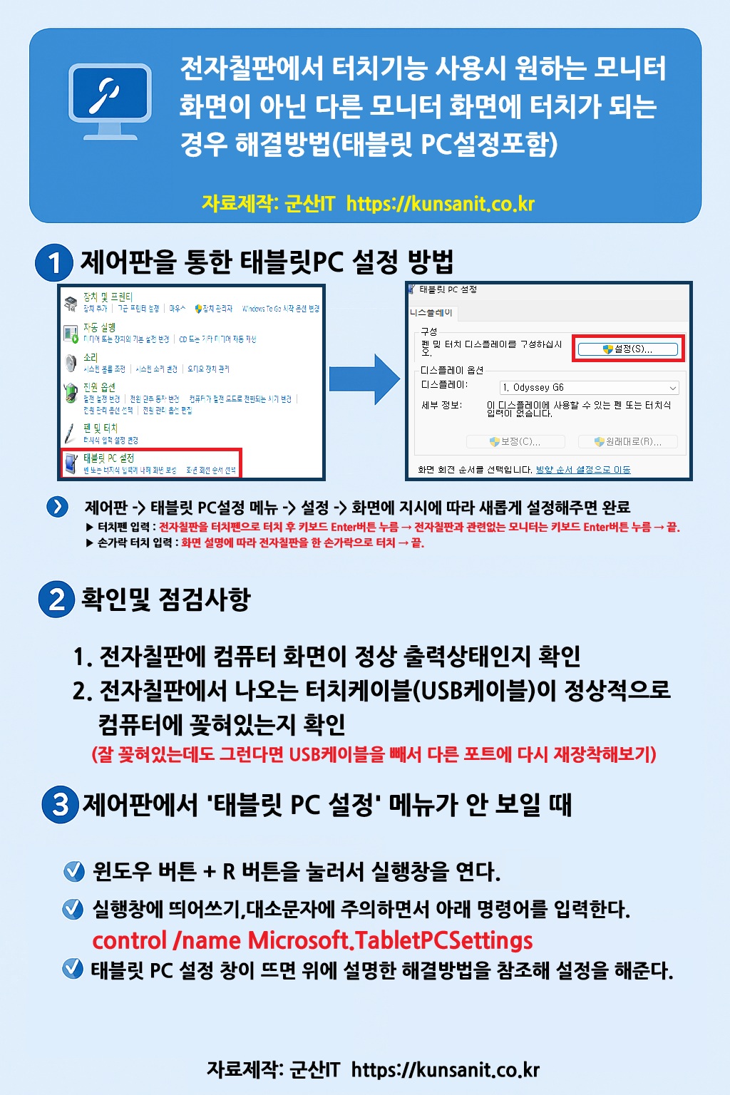 전자칠판에서 터치기능 사용시 원하는 모니터 화면이 아닌 다른 모니터 화면에 터치가 되는 경우 해결 방법(태블릿 PC 설정)