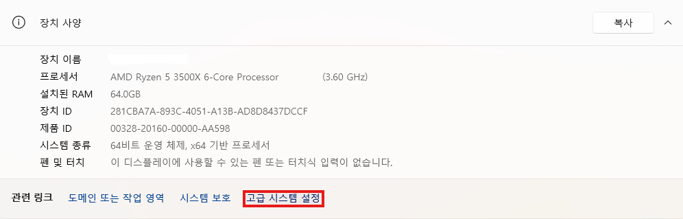 "고급 시스템 설정" 링크를 클릭해줍니다.